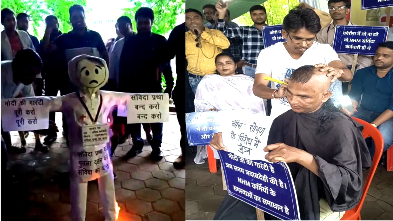 छत्तीसगढ़ में संविदा शोषण के खिलाफ राष्ट्रीय स्वास्थ्य मिशन (एनएचएम) कर्मचारियों का आंदोलन लगातार जारी है। आज हड़ताल के छठवें दिन कर्मचारियों ने मुंडन कराकर विरोध जताया और संविदा प्रथा का पुतला दहन कर सरकार के खिलाफ अपना आक्रोश प्रकट किया।